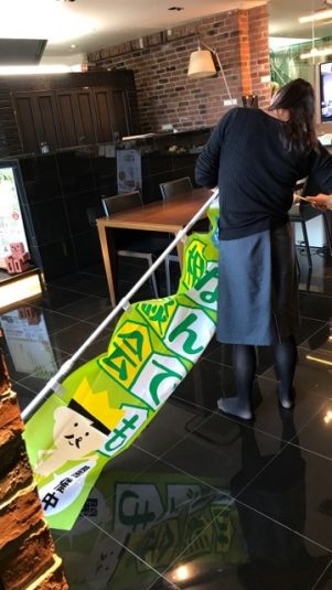 近代ホームの本社に行くと、何やらスタッフがこのキャラクターのノボリを旗竿に取り付け中。