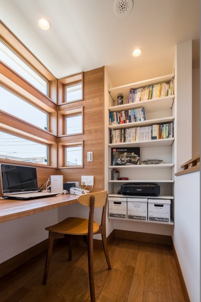 家の中央部に規則正しく並ぶ窓。隅をデザインすることも空間を広げる工夫。