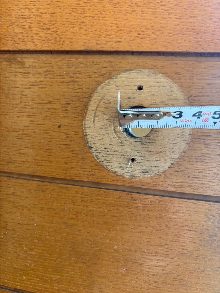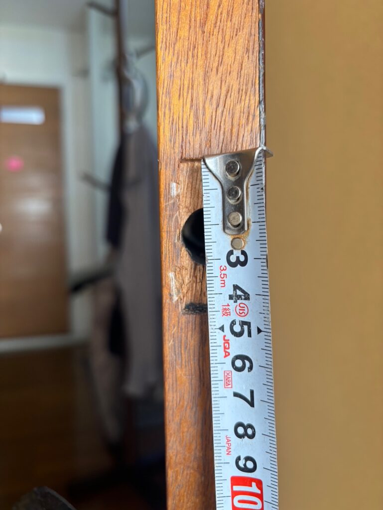 ドアノブを取り外して既存の穴の寸法など測ります。