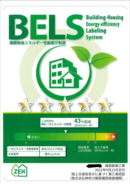 近代ホームでは住宅の性能の見える化の指標の一つの『BELS(ベルス)』を全棟取得しています。