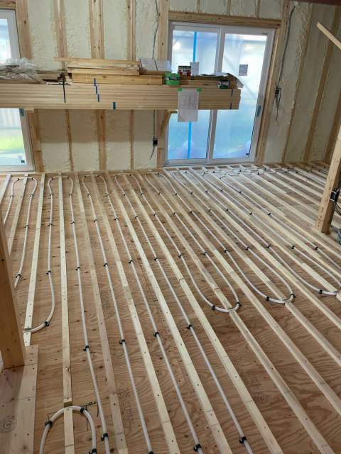 1階は 床暖房パイプの根太の上にフローリングを貼っていきます