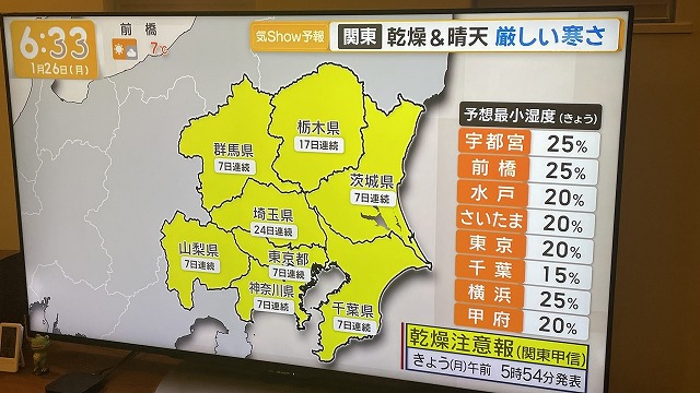 先日朝のテレビを見ると『乾燥注意報』が出ていました。