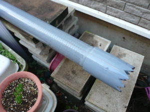 井戸枠用の塩ビ管は先を加工したり、塩ビのパイプに細かい穴を開けたりと色々大変!