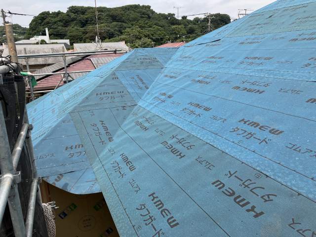 屋根の野地板に下葺き材を設置することで雨水の浸入を防いでいます。