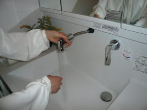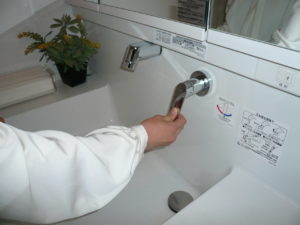 洗面化粧台の上に蛇口が取り付けられているので、蛇口を閉める時に