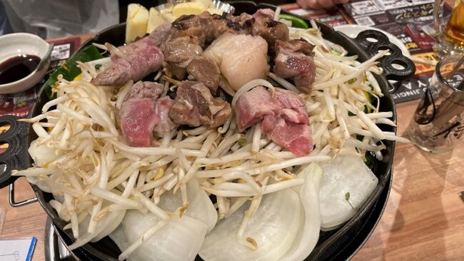 懇親会はもちろんジンギスカン。この店は食べ放題・飲み放題で美味しくて