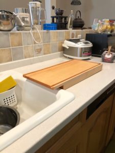 まな板の先端がシンクへ延びるように下を欠き、