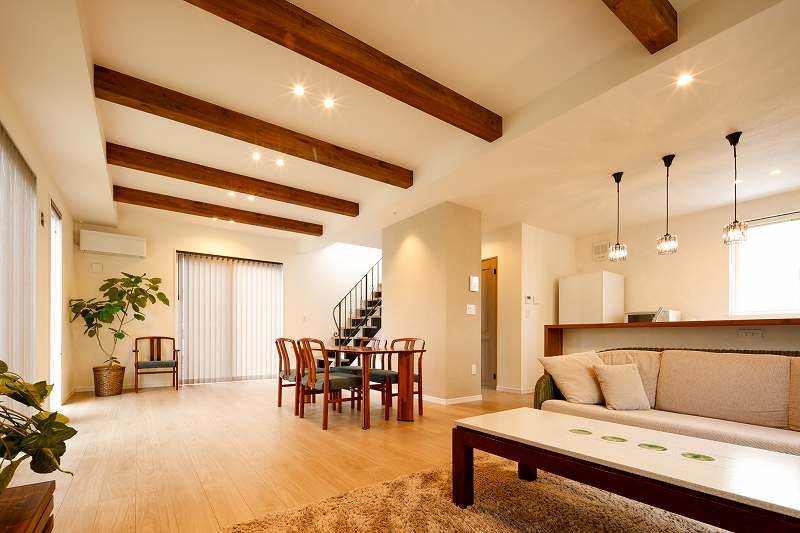 赤レンガとお庭の緑を楽しむ、吹き抜けリビングの家