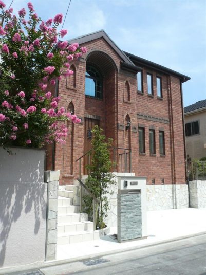 赤いレンガの外観に乱形の石貼りと白いタイルで玄関に至るアプローチを作り、