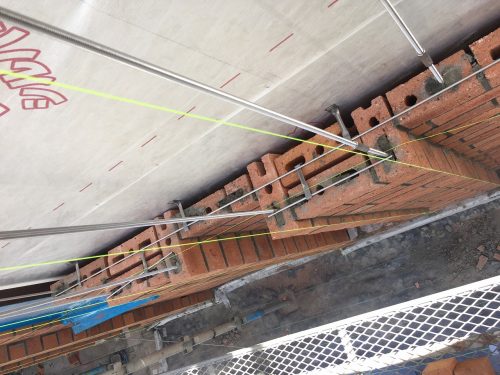 レンガ積みをする上で、糸で墨だしを行います。 レンガの穴に鉄筋棒を使い、連結します。 レンガと建物が一体にする為、タイで繋ぎます。