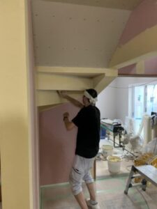 クロス工事が始まると石膏ボードをとめるビスなどの下地処理をします。