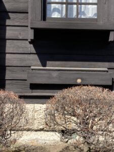 窓上には霧除けがつけられて、木製サッシを腐りにくくしてあります。